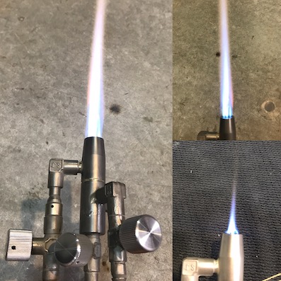 小さいバーナーでありますが、2ステージ(内炎と外炎)になっており、内炎と外炎を別々に 調整することができます。これにより、さまざまな形状の炎を出すことができます。(図1)